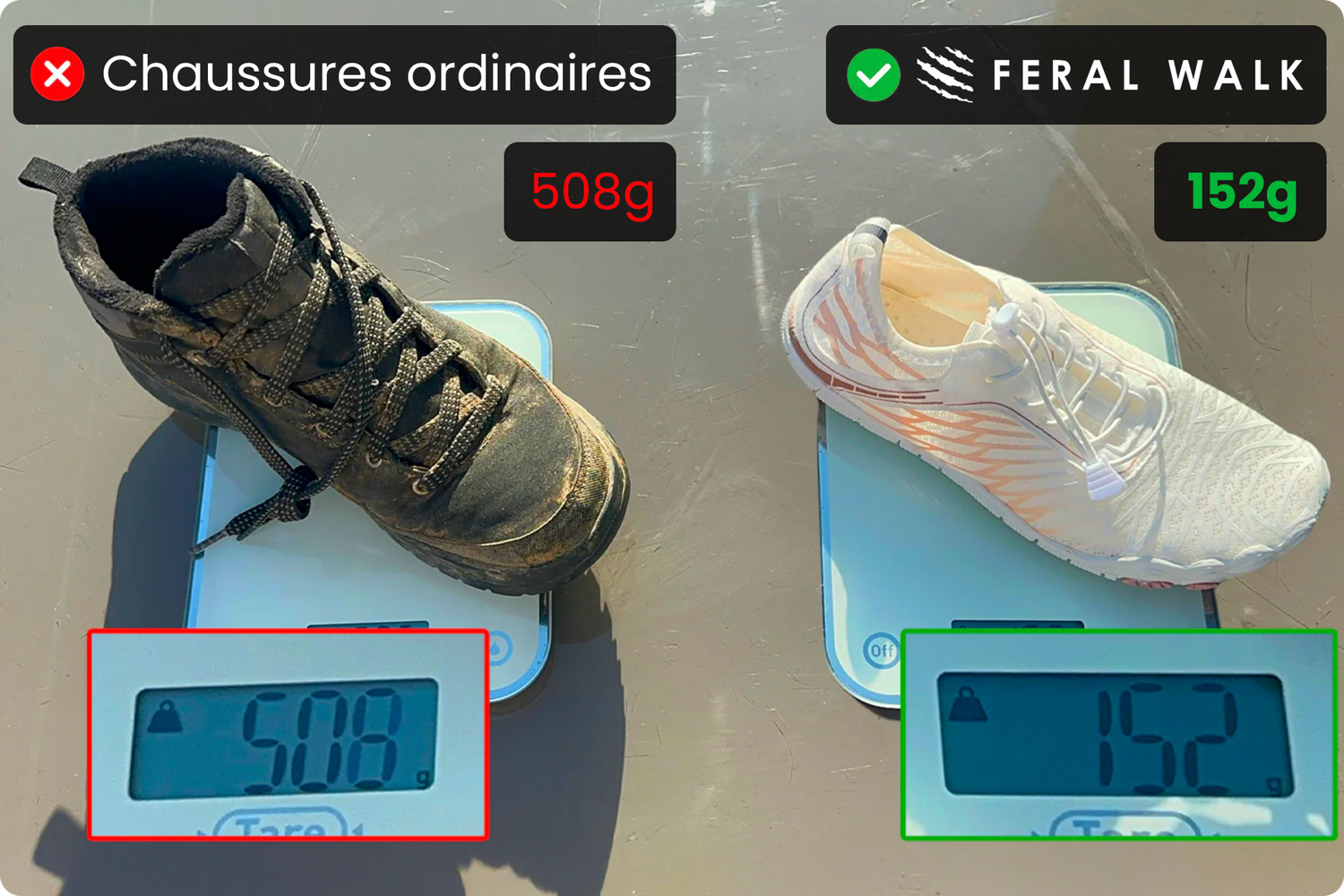 Bien que Feral Walk favorise le mouvement naturel du pied, ce n'est pas la même chose que d'être pieds nus. Nos chaussures offrent une protection essentielle contre les objets tranchants, les températures chaudes et les surfaces rugueuses, tout en permettant à vos pieds de fonctionner naturellement.